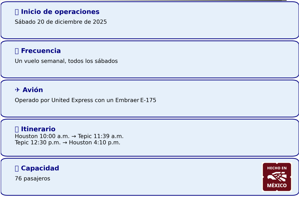 Se anuncia que se ofrecerán vuelos directos desde el Aeropuerto Intercontinental George Bush a partir del 20 de diciembre de 2025. El nuevo servicio está programado para salir de Houston a las 10:00 a.m. y llegar al Aeropuerto Internacional Tepic-Riviera Nayarit a las 11:39 a.m. El vuelo de regreso está programado para salir a las 12:30 p.m., con hora de llegada a las 4:10 p.m.