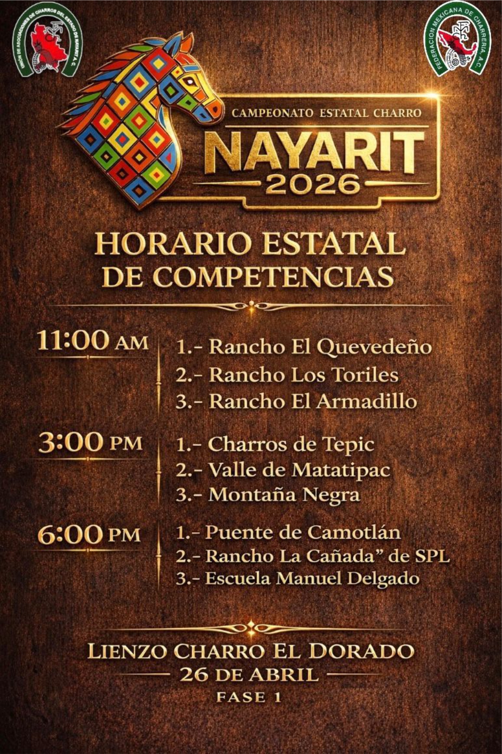 charrería Nayarit, Campeonato Estatal Charro 2026, Tepic eventos, cultura nayarita, lienzo charro Rancho El Dorado, escaramuzas, tradición mexicana, eventos gratis Tepic, cultura wixárika, charros Nayarit