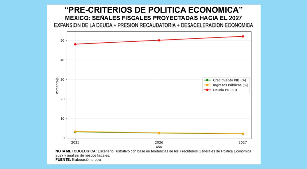 Sumario: Los Precriterios de Política Económica 2027 revelan un escenario de menor crecimiento, presión fiscal y mayor endeudamiento, lo que podría comprometer la sostenibilidad financiera del país en el mediano plazo.
