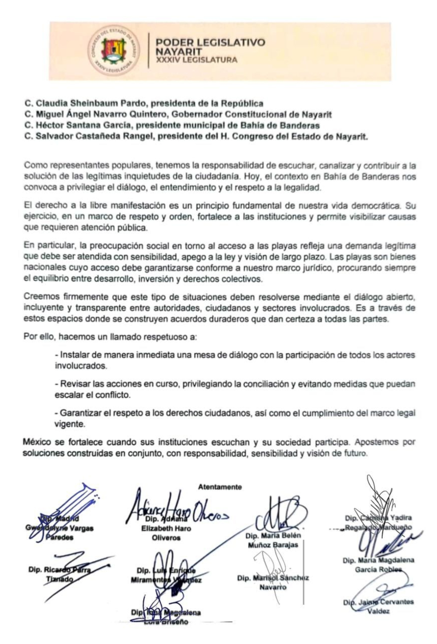 Sumario: Diputadas y diputados de la XXXIV Legislatura de Nayarit emitieron un pronunciamiento público para pedir una mesa inmediata de diálogo ante el conflicto por el acceso a playas en Bahía de Banderas, llamando a privilegiar legalidad, conciliación y derechos ciudadanos.