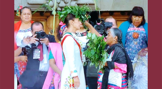 La doctora Claudia Sheinbaum recibió el bastón de mando otorgado por los pueblos originarios y el afromexicano, en la Plaza de la Constitución, más conocido como el zócalo de la Ciudad de México, en donde unas mujeres representantes de los 70 pueblos originarios y el afromexicano, invocaron a las fuerzas universales, a nuestros antepasados, a la Madre Tierra, a la Madre Naturaleza, así como a las fuerzas cósmicas para que la protejan y la hagan hacer mejor su trabajo en bien del país que recibe bajo su cargo y encargo.