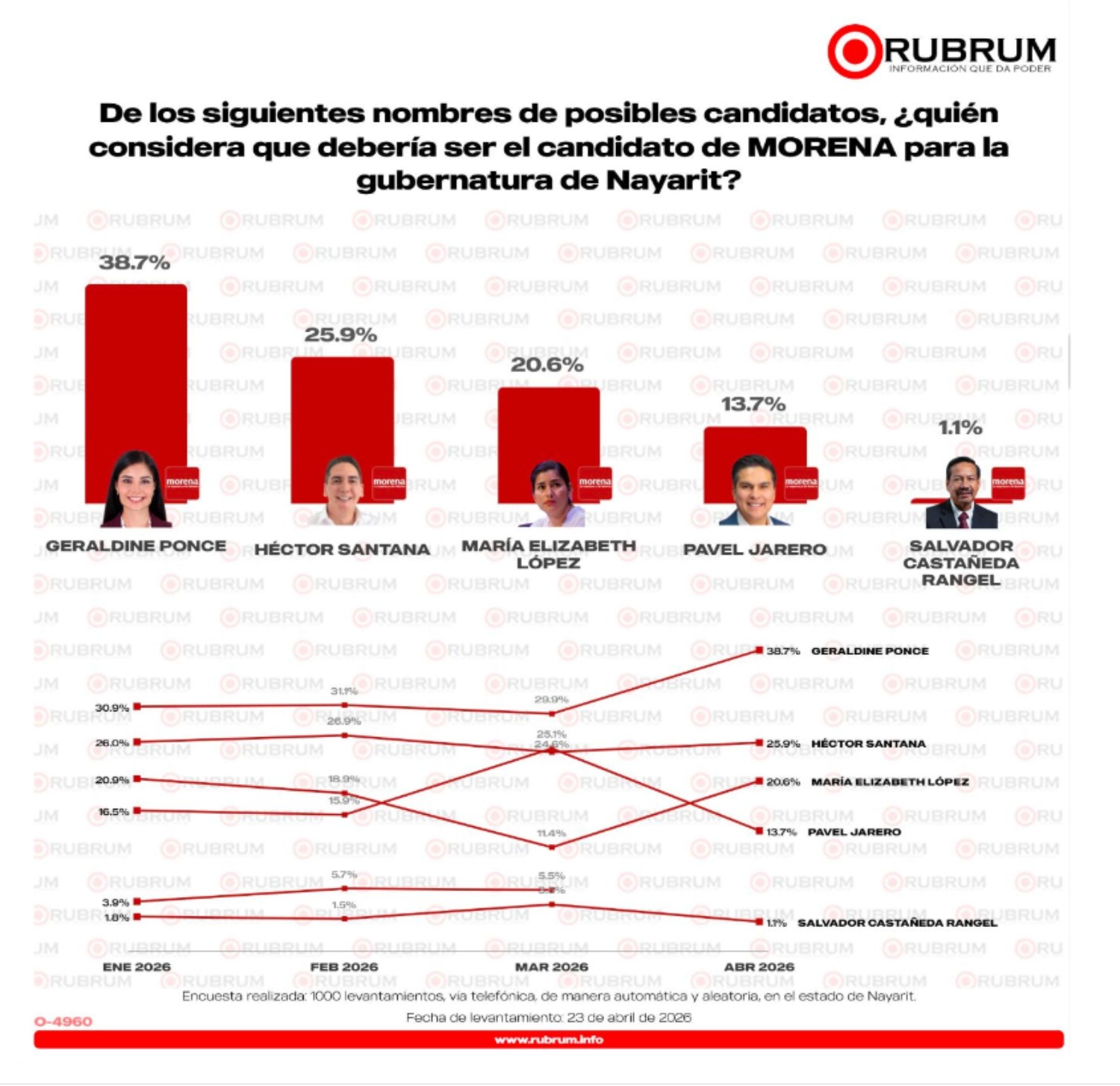Con una ventaja creciente y un perfil que conecta con sectores morenistas, la encuesta de Rubrum abre nuevamente el debate sobre quién encabezará el proyecto guinda en Nayarit.