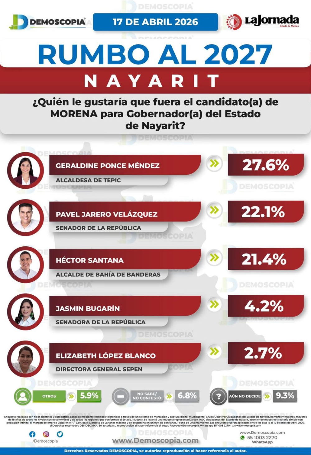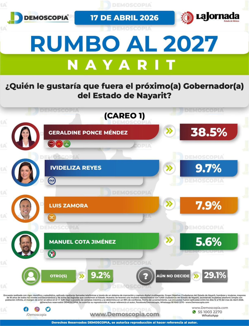 La más reciente medición de Demoscopía Digital sobre el escenario electoral en Nayarit rumbo a la gubernatura de 2027 coloca a Geraldine Ponce como la figura con mayor preferencia ciudadana en el arranque del proceso.