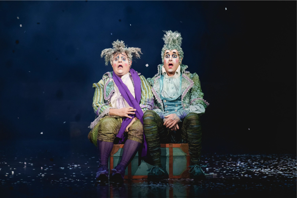 La tormenta de nieve. Los Payasos cuentan su propia historia de soledad, amor perdido y desesperación a través de la poesía y la comedia física. Con una sorprendente tormenta de copos de nieve de papel, sacuden el centro del reino para dejar espacio a la renovación.