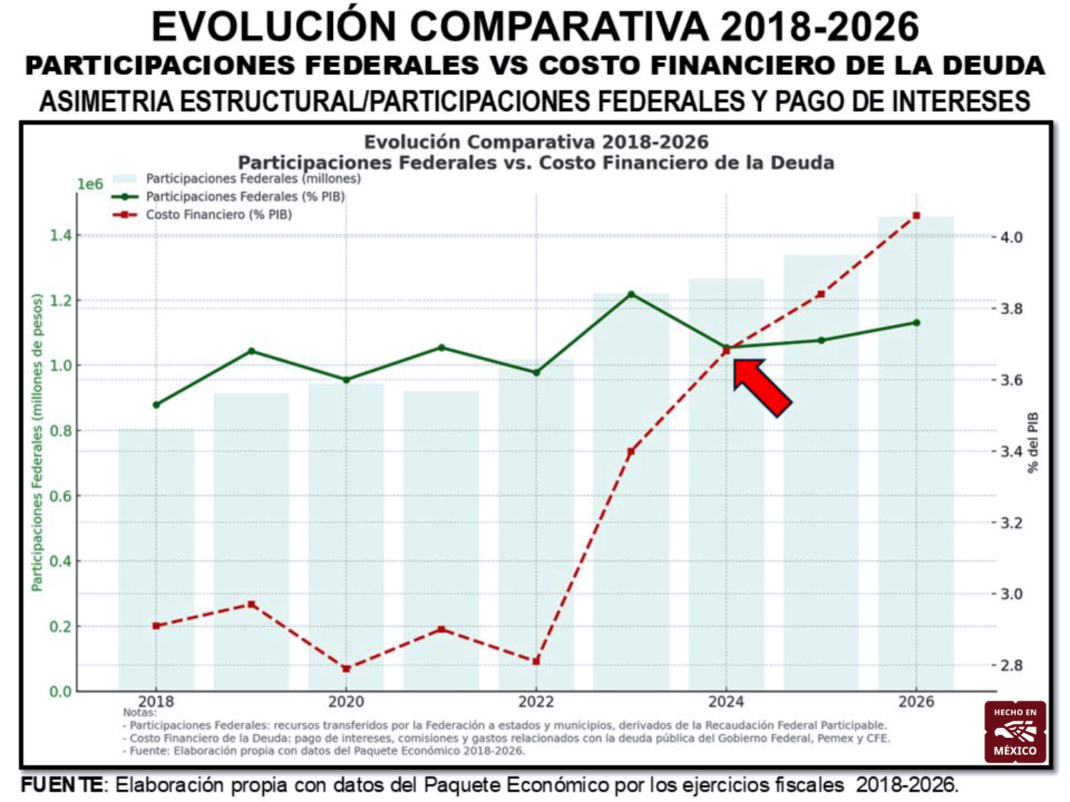 El gráfico comparativo 2018-2026 evidencia una asimetría estructural: mientras los gobiernos locales mantienen una dependencia relativamente constante de las participaciones federales, la Federación destina cada vez más recursos al pago de intereses, comisiones y gastos relacionados con la deuda pública.