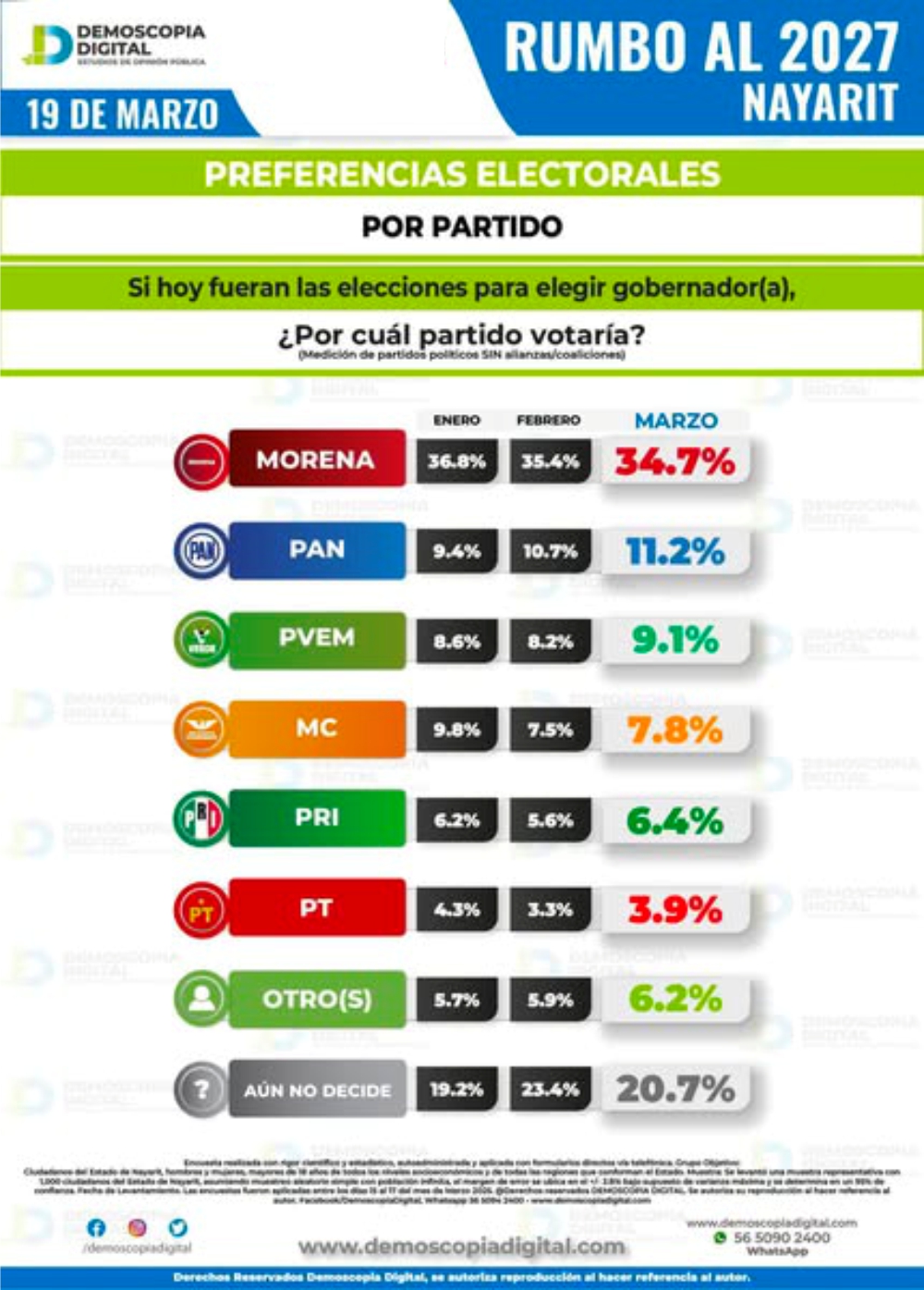 Las imágenes de abajo muestran los números fríos de un partido que promete seguir gobernando en nuestra entidad. Tenemos el caso de Demoscopía Digital con un 34.7% de aprobación, así también, tenemos a RUBRUM con un 41.6 y a MassiveCaller con un 54.0 %.