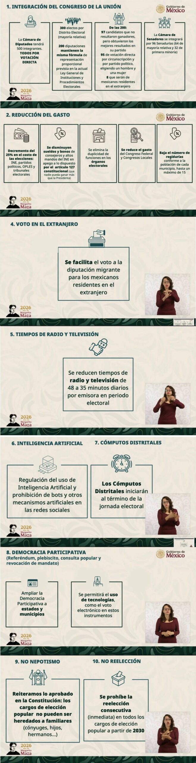 La mandataria federal anunció que el próximo lunes enviará al Legislativo una reforma electoral estructurada en 10 puntos, enfocada —según dijo— en cambiar la forma en que se eligen legisladores, no la composición de las cámaras. El eje central: menos gasto, más voto directo y mayor fiscalización.